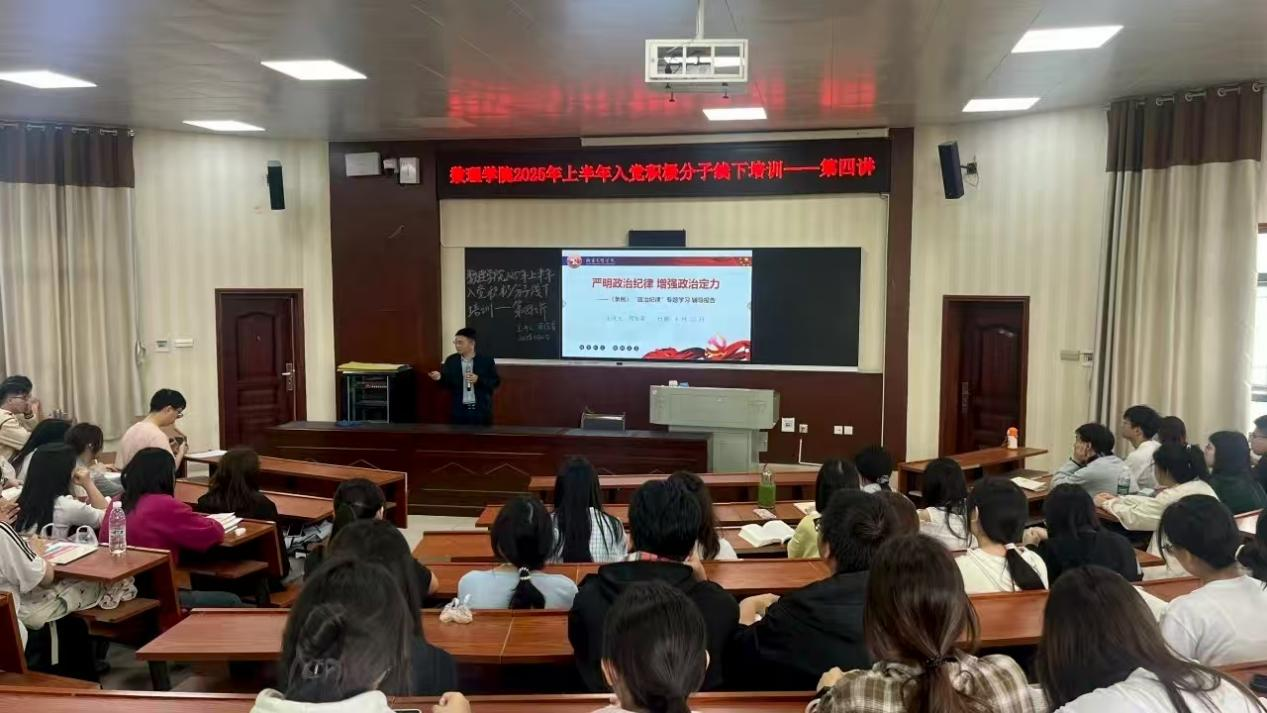 为帮助入党积极分子深刻理解党的政治纪律内涵,增强政治定力,树立纪律意识,数理学院于2025年4月22日中午12:30开展入党积极分子线下培训第四讲,本次培训由数理学院党委书记周惊雷授课。
