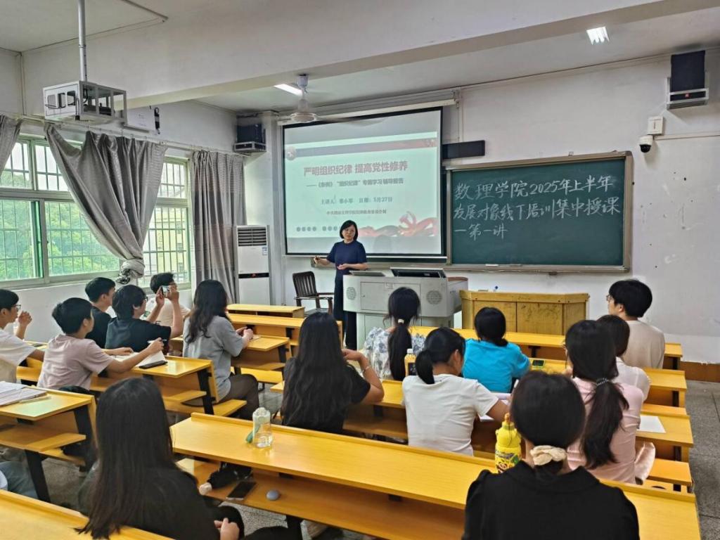 为引导数理学院2025年上半年党员发展对象明确党的组织纪律,坚定理想信念,不触碰“警戒红线”,数理学院于2025年5月27日下午16:30开展了题为“严明组织纪律,提高党性修养”的党员发展对象线下培训第一讲,本次课程由数理学院副院长黎小琴讲授。