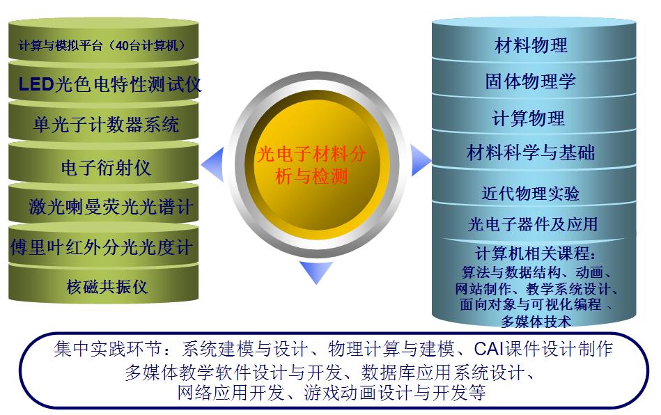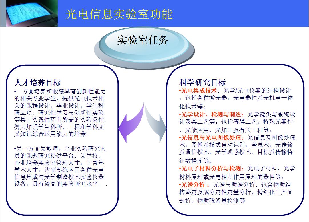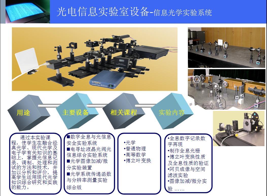 光电信息实验室是“光电信息科学与工程”、“电子信息科学与技术”、“物理学”、“教育技术学”、四个本科专业的专业实验室,同时面向材料科学与工程、机械电子工程及信息与计算科学专业开放。实验室可以承担上述多个本科专业3200人次的专业实验、课程设计、毕业设计以及研究型学习与创新性实验项目的教学任务。